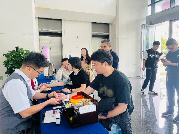 活动现场,爱心气氛热烈有序。采血车旁,献血中心工作人员全程耐心引导,大家认真填写表格、测量血压、抽血化验,每一个步骤都井然有序。当细长针头刺入臂弯时,虽有片刻的紧张,但更多的是写在他们脸上的坚定与从容。一袋袋温热的血液,轻轻摇晃的是能化人的深情厚谊。